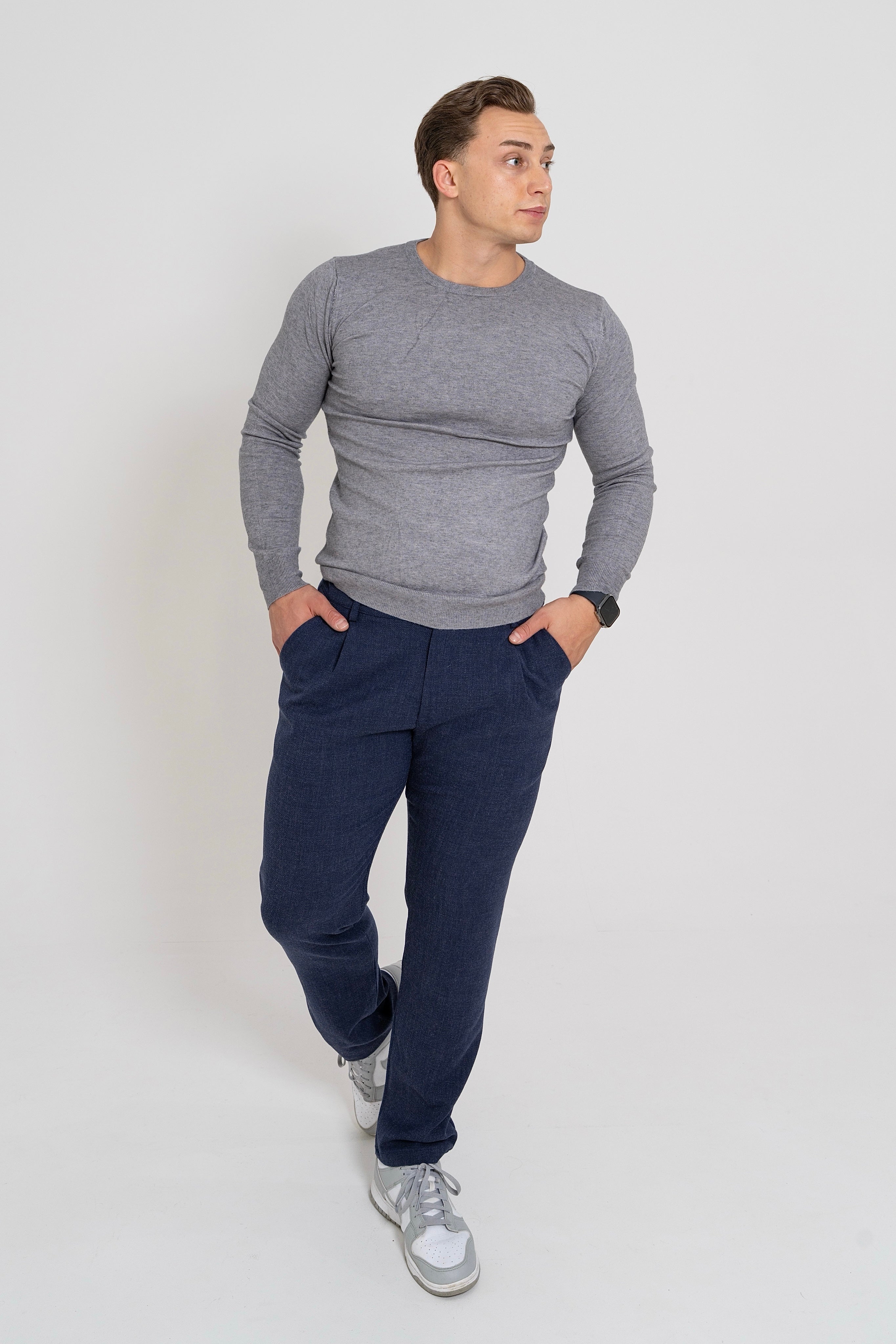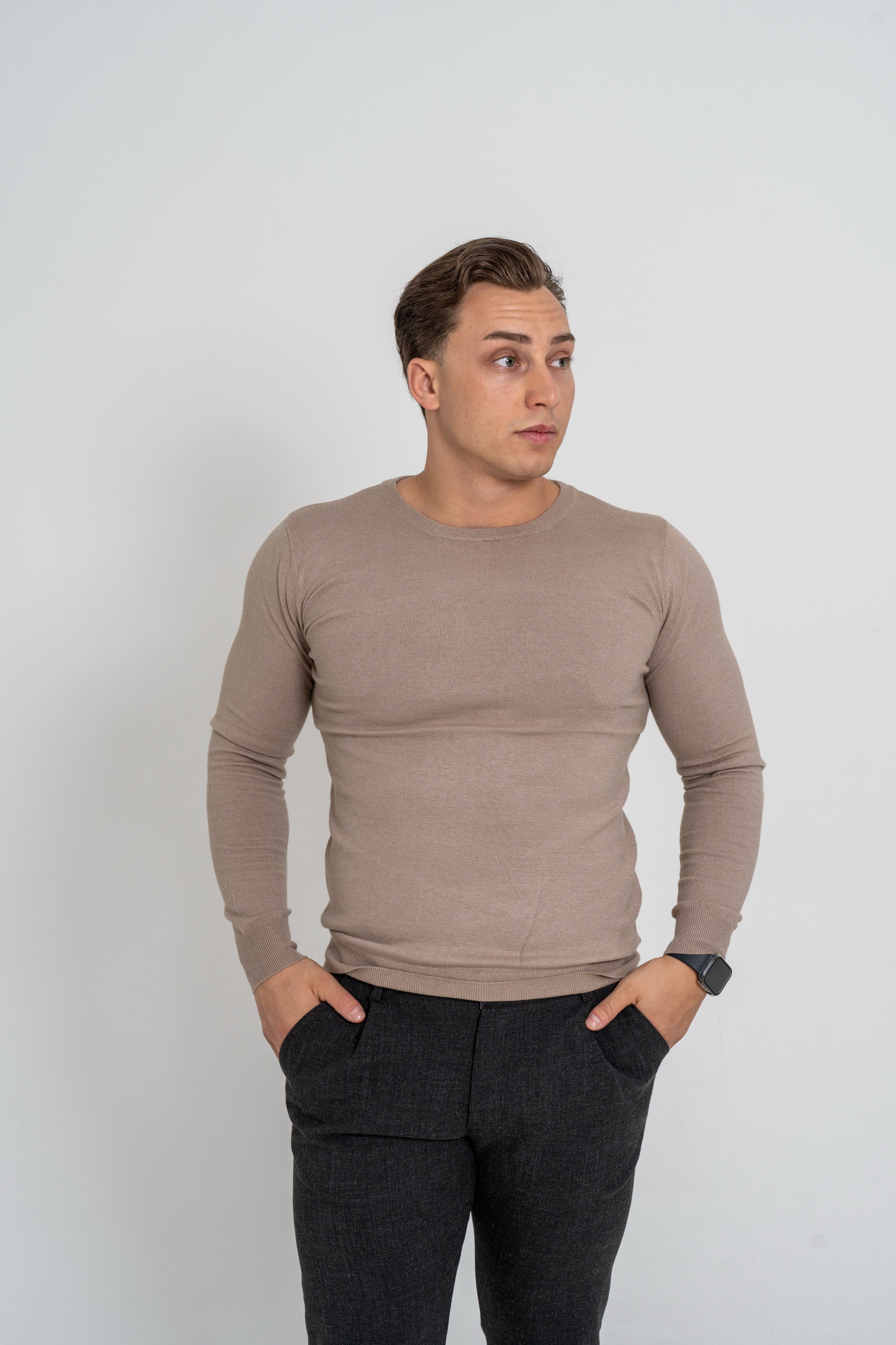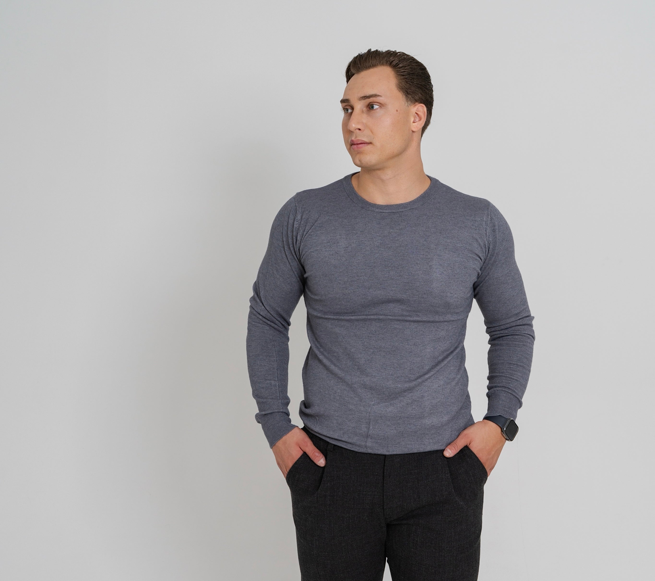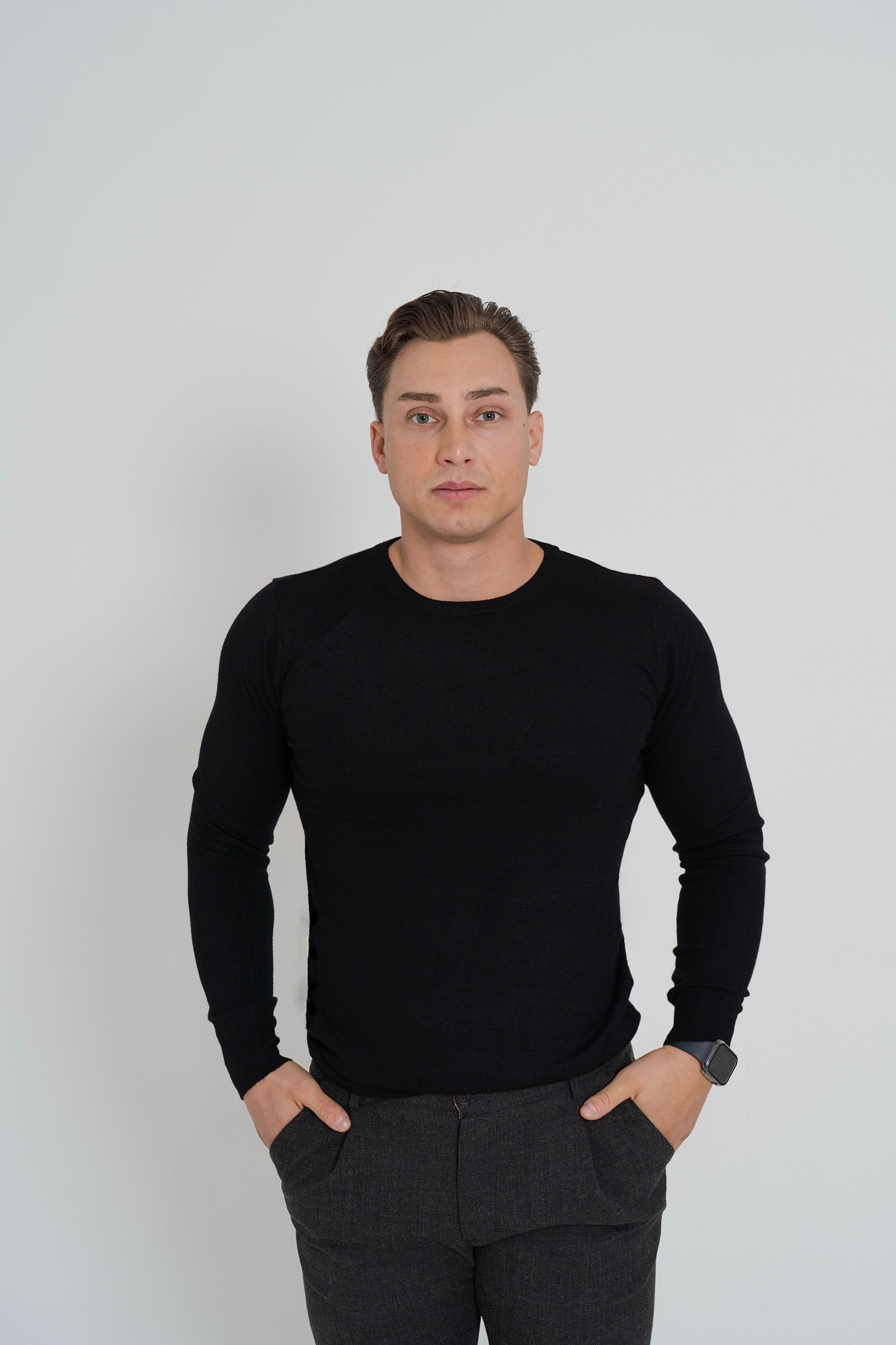 This fitted pullover delivers understated elegance with a luxuriously soft touch against the skin. Crafted from a refined blend of 45% acrylic, 35% cotton, and 20% wool, it combines breathability with gentle warmth for year-round versatility. The close-fitting silhouette creates a polished, contemporary look that transitions effortlessly from casual to refined settings. Modeled here in size XL on a 1.85m frame, showcasing the garment's flattering proportions and impeccable drape.